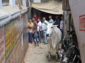 In den engen Gassen von Varanasi sind uns ständig Kühe begegnet, wir mussten manchmal eng an der Mauer entlang gehen um diese zu passieren. Die blöden Kühe entledigen sich, wo sie stehen und gehen, dass kann in so einer Gasse schon mal zu einer Kuh-Pipi-Flutung führen, zudem liegen überall Kuhfladen herum. Die Menschenmassen und die Motorräder, die sich durch die Gassen schieben, verteilen das Ganze dann auch noch. Es stinkt penetrant und man muss höllisch aufpassen, wo man hintritt. Um die Gerüche abzuwenden, werden dann noch Räucherstäbchen angezündet und schon hat man den besonderen Duft Varanasis. Neben den Kühen leben in der Stadt unzählig viele Hunde und Affen sowie ein paar Ziegen.
