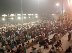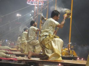 Jeden Abend kurz nach Sonnenuntergang findet am Ganges eine hinduistische Zeremonie statt – die Ganga Aarti. Hierbei wird dem Ganges gedankt und ein Opfer in Form von Blumen und Kerzen gebracht. Zu diesem Spektakel versammeln sich tagtäglich sehr viele Menschen am wichtigsten Ghat im Zentrum der historischen Stadt. Es herrscht ein großes Durcheinander und es wimmelt von fliegenden Händlern, die Opfergaben oder Andenken im kunterbunten indischen Stil verkaufen. Das Ghat ist voll von hinduistischen Gläubigen und wenigen Touristen, die auch in unzähligen kleinen Booten vom Ganges aus die Zeremonie begleiten. Auffällig ist auch die große Anzahl der ganz in orange gekleideten Bettelmönchen (Sadhus), teilweise mit Gesichtsbemalungen und Dreadlocks.