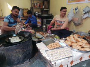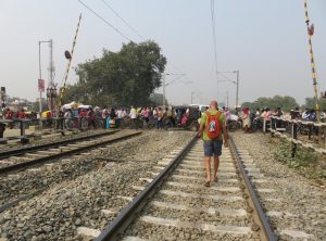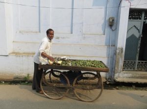 An einem Tag sind wir 12 km in Flip Flops aus der Stadt heraus Richtung Sarnath spaziert, einer alten buddhistischen Gebetsstätte, die heute nur noch aus Ruinen besteht und ein Museum ist. Es ging zunächst 3 km am Ufer des Ganges entlang, vorbei an badenden Hindus und Wasserbüffeln sowie an einer Beerdigung an einem Ghat, an dem sich das Holz für die Einäscherung der Verstorbenen stapelte. Etwas weiter wurde im Ganges Wäsche gewaschen und an den Treppen der Uferbefestigung zum Trocknen ausgelegt. Wir sind in ein Wohnviertel abgebogen und haben uns für wenige Cents am Straßenrand mit kleinen deftigen und süßen Snacks gestärkt. Danach ging es noch ein paar Kilometer an Gleisen entlang. Für Inder scheint es ganz normal zu sein, Bahnschienen als Fußweg zu benutzen und die relativ gemächlich dahinfahrenden Züge kündigten sich immer durch lautes Hupen an. In Indien wird also nicht nur auf den Straßen gehupt. Am Ziel angekommen erholten wir uns zunächst und genossen eine frische Kokosnuss, wir bezahlten den Eintritt und schauten uns die Anlage inklusive einer sehr alten und großen Stupa an. Für den Rückweg nahmen wir uns ein Tuk Tuk, unser Fahrer drängelte sich hupend durch die vollen Straßen bis in die Nähe unseres Hostels. Den letzten Kilometer sind wir gelaufen, weil ein alter umgestürzter Baum die Straße und damit den Zugang versperrt hat.