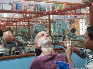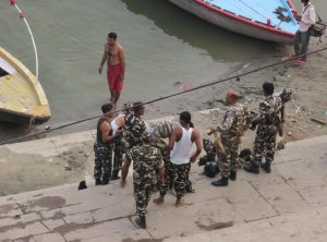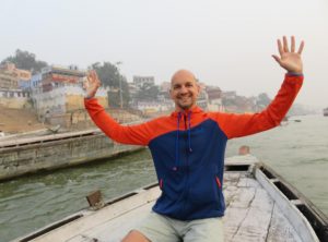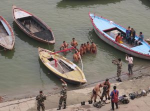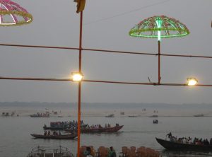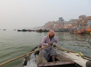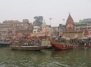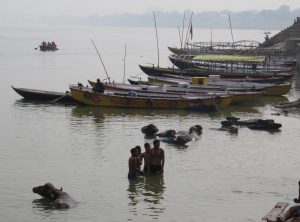 Am nächsten Morgen machten wir eine Bootstour zum Sonnenaufgang auf dem Ganges. Wir verhandelten am Ghat kurz und hart über den Fahrpreis und setzten uns zu unserem Bootsmann Samos in eine hölzerne Nussschale. Wir warteten noch auf einen weiteren Fahrgast und um 6 Uhr morgens ruderte Samos los raus auf den Ganges. Wir sahen die Ghats, die alten Häuser und Tempel nun vom Fluss aus. Die erhoffte romantische, morgendliche Atmosphäre wollte nicht so recht aufkommen, die Sonne schaffte es kaum durch den Dunst und Smog, der permanent über der Stadt hängt. Wir ruderten etwas den Ganges hinauf und hinunter und sahen die Beisetzungszeremonien diesmal vom Fluss aus, auch um diese Uhrzeit herrschte schon reges Treiben. Am Ufer waren schon viele gläubige Hindus bei ihrem morgendlichen Bad. Nach einer Stunde steuerte der Kapitän zurück ans Land und wir schlenderten zurück in unser Hostel, um uns bei einem kurzen Schläfchen vom frühen Aufstehen zu erholen.