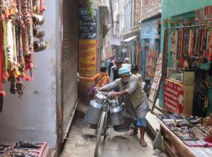 Unser Quartier im Gassengewirr war die Brown Bread Bakery, ein schlichtes aber sehr geschmackvoll eingerichtetes Guesthouse. Wie wir später erfuhren, ist der Besitzer aus Deutschland. Das Guesthouse hatte im Erdgeschoss ein Restaurant und auf dem Dach eine Terrasse mit gemütlichen Sitzgelegenheiten. Geschützt war diese Terrasse von einem Gitter, damit die zahlreich vorhandenen Affen nicht das Essen vom Teller klauen oder in das Gebäude gelangen. Unser gemütliches Zimmer mit eigenem Bad lag im 2 Stockwerk. Wir stellten schnell fest, dass die Gassen von Varanasi noch verwinkelter und enger als die von Thamel in Kathmandu sind. Aus vielen Winkeln duftet es lecker nach irgendwelchen Speisen oder Räucherstäbchen. Dieser Duft vermischt sich aber mit den unangenehmen Gerüchen der allgegenwärtigen Hinterlassenschaften der heiligen Kühe und vom Müll. Durch die Gassen, die kaum breit genug für zwei Menschen nebeneinander sind, drängeln sich laut hupende Motorradfahrer, Unmengen von Menschen und es bleibt kaum mehr Platz, an den vielen Kühen vorbei zu kommen, die oft ganz entspannt mitten auf dem Weg herum stehen oder liegen.