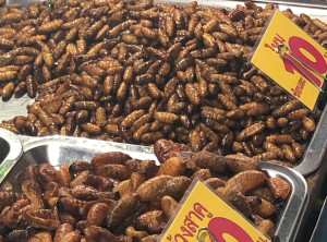 Das Streetfood Angebot war für unseren europäischen Geschmack teilweise sehr gewöhnungsbedürftig. Neben uns geläufigen Dingen wir Hühnchen, wurden frittierte Heuschrecken und anderes Krabbeltier oder Dinge verkauft, von denen wir nur ahnen konnten, was es ist. Wie es sich für eine Party gehört gab es auch noch eine große Bühne von der laute Musik dröhnte, viele feierlustige Thais versammelten sich auf der Tanzfläche.
