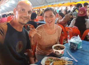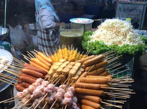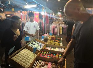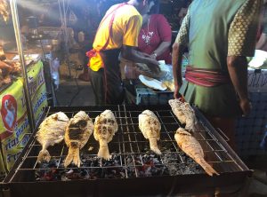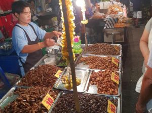 Das Streetfood Angebot war für unseren europäischen Geschmack teilweise sehr gewöhnungsbedürftig. Neben uns geläufigen Dingen wir Hühnchen, wurden frittierte Heuschrecken und anderes Krabbeltier oder Dinge verkauft, von denen wir nur ahnen konnten, was es ist. Wie es sich für eine Party gehört gab es auch noch eine große Bühne von der laute Musik dröhnte, viele feierlustige Thais versammelten sich auf der Tanzfläche.