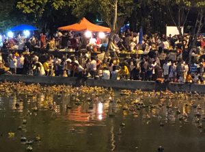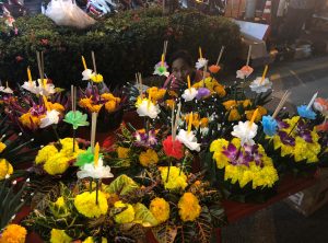 Wie auf einem Volksfest, gab sehr viele Stände, an denen hauptsächlich Leckereien und viele bunte schwimmbare Blumengestecke verkauft wurden. Die Gestecke mit einer Kerze in der Mitte und guten Gaben werden den Thais in einem Fluss gesetzt. Diese Tradition soll aus dem Hinduismus kommen und die schwimmenden Flöße sollen alle Verunreinigungen der Seele mitnehmen.