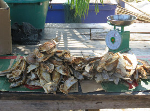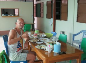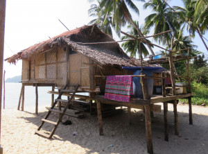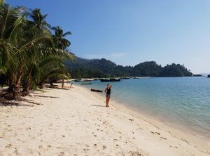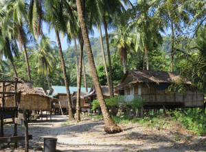 Die nächste Etappe war eine bewohnte Insel. Zunächst genossen wir dort unser Lunch, welches am Strand unter Palmen serviert wurde und aus verschiedenen Meeresfrüchten, Gemüse und Reis bestand. Bei uns am Tish saßen Francis und die zwei Deutschen, die sich weiter konsequent an ihr Bier hielten. Nach dem Essen besuchten wir die Moken People, die auf dieser Insel wohnen. Diese Volksgruppe lebt auch heute teilweise noch halbnomadisch auf Schiffen und zieht in der Trockenzeit von Insel zu Insel.