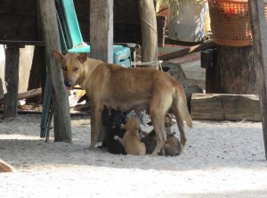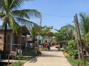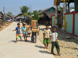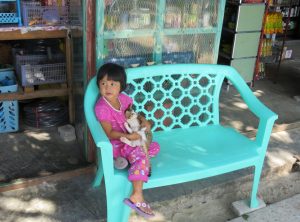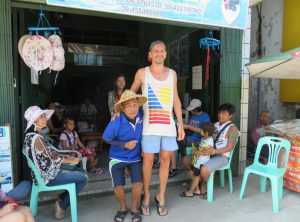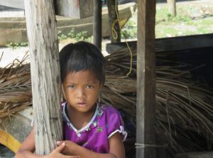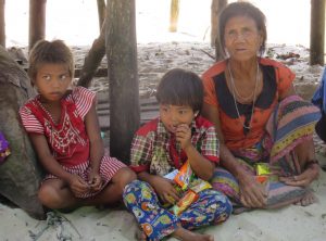 Auf dem Weg zum Dorf wurden große Mengen Süßigkeiten verkauft, die als Gastgeschenke bei den Inselbewohnern willkommen sind. Es handelt sich um lauter einzeln verpackte Kekse, Kuchen oder auch süße Getränke. Die Touristen aus Myanmar, die mit uns im Boot waren. kauften einige Tüten gefüllt mit diesen Snacks und verteilten diese großzügig. Ein paar schlaue Kinder stellten sich wieder hinten an und erhielten die zweite Ladung. Es war ein bisschen wie Halloween oder Martini in Norddeutschland, es türmten sich Berge von Süßigkeiten. Unser Guide erklärte uns, dass sich die Inselbewohner oft versteckt haben und sich erst wieder zeigen, seitdem etwas mitgebracht wird. Da jeden Tag ein Boot ankommt, türmen sich nicht nur die Süßigkeiten – auch die Verpackungsfolie fliegt überall herum.