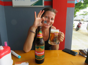 Am ersten Tag erkundeten wir etwas die Gegend und spazierten 3 km durch Wohnviertel der Stadt bis zum Busbahnhof, um dort die Optionen für die Weiterreise zu checken. Zurück ging es ebenfalls zu Fuß, vorbei an spielenden Kindern und geschäftigen Burmesen. Wir stiegen auf einen kleinen Hügel und bestaunten einen sehr großen Buddha. Nach dem Abstieg erholten wir uns schließlich bei einem Myanmar Bier an der Strandpromenade. Der gesamte Streifen am Wasser ist wenig touristisch und es tummeln sich Fischerboote am Ufer. Die Bierflaschen sind hier mit 640 ml recht groß, im Restaurant kostet eine 2000 Kyat (1,12 Euro), bei 34°C ist man da schnell beschwipst. Im Kronkorken von Markus Flasche versteckte sich zu unser Freude ein Gutschein für ein Freibier, welchen wir auch direkt einlösen mussten, am Nachmittag schliefen wir unseren Rausch aus. 🙂