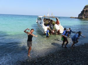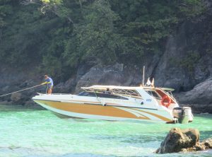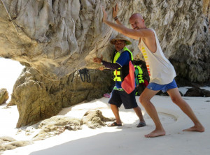 Für den zweiten Tag buchten wir eine Tour mit einem Speedboot, dieser Ausflug kostete pro Person etwas mehr als 60 Euro, dass ist zwar viel Geld aber auch ist die einzige Möglichkeit die Inseln zu besuchen. Alle Mitreisenden versammelten sich nach der Abholung im Hotel im Tourbüro. Unser Guide machte erstmal ein paar Späßchen über die Körpergröße von Markus und seine eigene, dann starten wir unser Abenteuer mit einer zweistündigen Fahrt über das Wasser zu einer wunderschönen kleinen unbewohnten Insel mit langem weißen Strand und blauem Wasser. Dort gingen wir schwimmen und spazierten ein paar Minuten durch den Wald auf die andere Seite der Insel, wo uns unser Boot wieder einsammelte.