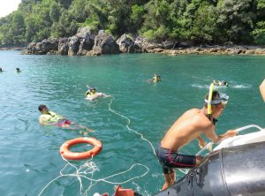 Im Anschluss an den Schwimmausflug machten wir in der Nähe eines felsigen Ufers halt, wir schwammen und schnorchelten ein wenig. Die Asiaten stiegen fast alle mit Schwimmwesten ins Wasser und hielten sich die meiste Zeit an einem der Rettungsringe fest.