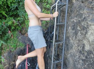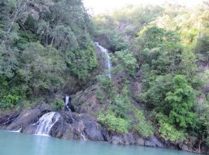 Nach dem Besuch auf der Insel fuhren wir mit dem Boot noch zu einem Wasserfall, der ins Meer mündet. Dort konnte man über eine Eisenleiter, die barfuß nicht gerade einfach zu erklimmen war, zum Wasserfall klettern. Nach dieser vorletzten Etappe ging es zurück in Richtung Myeik, kurz vor dem Ziel statteten wir noch einem riesigen liegenden Buddha auf einer Insel direkt vor Myeik einen Besuch ab.