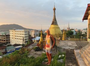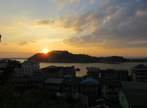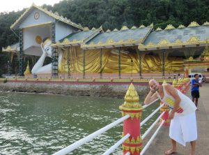 Zurück an Land verabschiedeten wir uns von der Gruppe und stiegen noch auf einen kleinen Hügel mit goldenen Pagoden, hier sahen wir die Sonne hinter der Insel mit dem liegenden Buddha unter gehen. Ein toller Tag, der aber auch kritisch gestimmt hat, ging zu Ende.