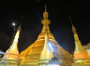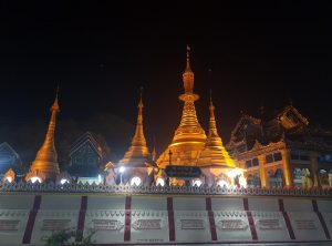 Den Abend nutzten wir für einen ausgedehnten Spaziergang zum Fluss und durch die City. Zurück zum Hostel führt ein kurzer Weg mit vielen Treppenstufen durch die Dunkelheit, oder ein doppelt so langer Weg zurück am Fluss entlang. Wir nahmen die Treppe und bestaunten die goldenen Türmchen einer Pagode. In Mawlamyaing gibt es einige Kirchen, Tempel und Pagoden zu bestaunen, in der Dunkelheit sind viele schön beleuchtet.