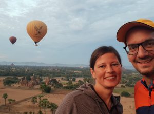 Am nächsten Morgen klingelte unser Wecker schon sehr früh um 4:45 Uhr für ein Highlight unserer bisherigen Reise. Niko hat mir zum Geburtstag eine Ballonfahrt zum Sonnenaufgang über Bagan geschenkt und heute war der große Tag. Wir wurden abgeholt und zum Startplatz gebracht. Da wir beide noch niemals Ballon gefahren sind, waren wir ziemlich aufgeregt. Am Startpunkt angekommen herrschte schon Trubel – an diesem Morgen stiegen insgesamt 16 Ballons mit ca. jeweils 10 Personen in den Himmel. Zunächst gab es ein kleines Frühstück mit Café, Tee und Gebäck. Danach wurden wir von unserem Ballonpiloten Nick eingewiesen.