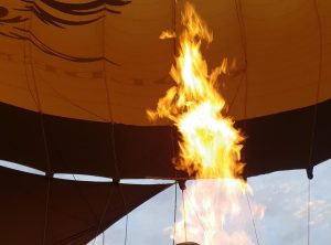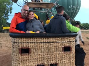 Die Ballons wurden zunächst mit Hilfe von Ventilatoren mit kalter Luft befüllt, bevor mit der Flamme ordentlich eingeheizt wurde und sie ihre Form annahmen. Erst dann durften wir in unseren Korb einsteigen und mussten zunächst in der Sicherheitsposition sitzen. Nick zündete den Brenner mehrmals und wir hoben ganz ganz ruhig ab – was für ein Gefühl. Da alles so ruhig von Statten ging, war die anfängliche Aufregung schnell vorbei und wir konnten die Aussicht genießen.