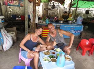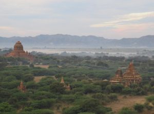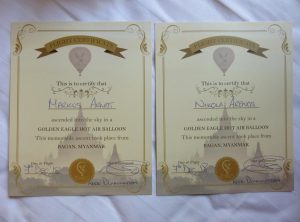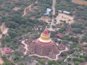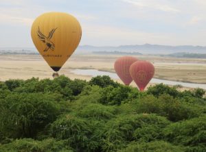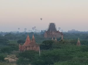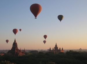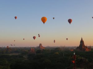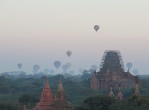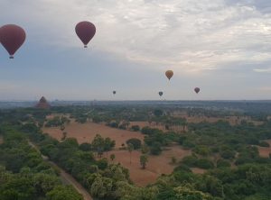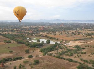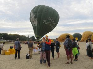 Es war wirklich ein unbeschreibliches Gefühl, so früh morgens lautlos über diese einzigartige Landschaft zu gleiten. Vor uns sahen wir bis zum Horizont hunderte von Pagoden zwischen den Bäumen – einfach phantastisch. Wir schwebten in Mitten der anderen Ballons, leider verflog die Zeit viel zu schnell und nach ca. einer Stunde landete Nick unseren Ballon mit etwas Ruckeln und einigen Helfern, die den Korb am Boden hielten. Zum Abschluss der Ballonfahrt gab es den traditionellen Champagner zu dem Nick einen Trost aussprach und dazu wurde etwas Obst und Bananenbrot gereicht. Wir genossen das prickelnde Getränk und waren vollkommen begeistert von diesem Erlebnis. Gerne ließen wir unsere Gläser nachfüllen…