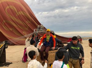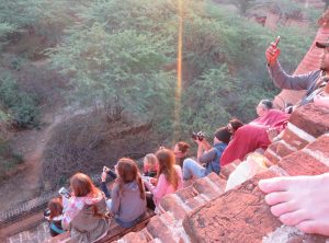 Am nächsten Morgen wollten wir uns die fliegenden Heißluftballons noch einmal von unten ansehen. Wir hatten während der Ballonfahrt von oben einen Tempel entdeckt, auf dem einige Personen den Sonnenaufgang vom Boden aus beobachteten und auch Nick unser Pilot hat diesen Ort empfohlen. Unser Wecker klingelte erneut vor der aufgehenden Sonne. Wir fuhren zu diesem Tempel und kletterten etwas waghalsig hinauf. Es waren schon einige Schaulustige anwesend, aber wir erwischten noch gute Plätze. Wir wussten ja aus welcher Richtung die Ballons zu erwarten waren.