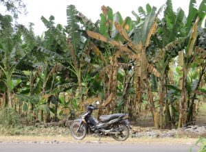 Beim Start in Mandalay lagen fast 190 Kilometer bis nach Bagan vor uns. Zunächst ging es über gut ausgebaute Straßen durch städtisches Gebiet, aber mit jedem Kilometer wurde es ländlicher und der Zustand der Straßen wurde schlechter, wir fuhren über holprige Abschnitte, teilweise gab es aber auch neue, sehr gut ausgebaute Teilstücke. In der ländlichen Region wurden Rinder, Schafe und Ziegen über die Straßen getrieben, wir fuhren vorbei an Bananenplantagen und sahen viele Papayabäume.