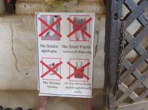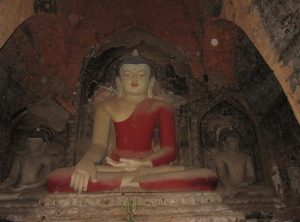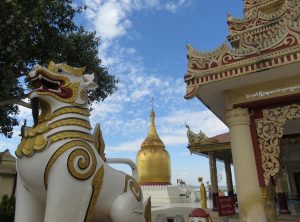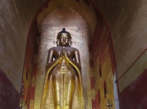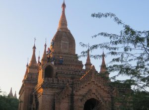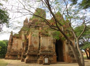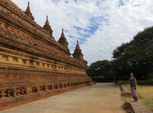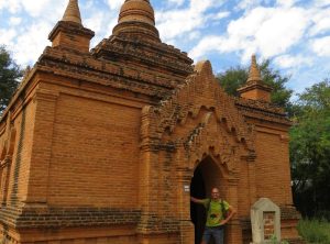35 Kilometer vor dem Ziel verlor ich bei voller Fahrt leider meine linke Kontaktlinse und Niko ist weitergefahren, obwohl ich an der Reihe war, wir hatten keine Lust, meine Brille am Straßenrand aus dem Rucksack zu kramen. Dummerweise hatten wir vergessen, Ersatzlinsen mit auf den Ausflug zu nehmen und musste nun mit der Brille vorlieb nehmen– den Großteil unseres Gepäcks hatten wir ja in Mandalay zurück gelassen. Gegen 16 Uhr erreichten wir Nyaung U und ab hier sahen wir rechts und links an der Straße die ersten Pagoden.