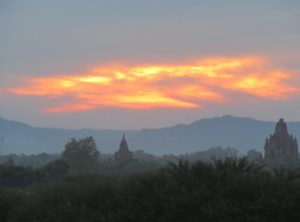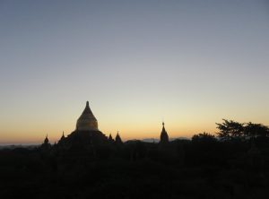 Bevor wir in unser Hotel eincheckten, machten wir auf dem Weg noch an einer Stelle Halt, an dem der Sonnenuntergang über den Pagoden besonders schön sein soll. Wir besorgten uns Myanmar Bier und ergatterten auf dem Aussichtspunkt einen guten Platz in der ersten Reihe. Uns gefiel dieser mystisch wirkende Ort sofort.
