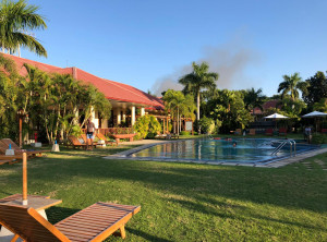 Von den vielen Buddhas und der Fahrt waren wir ziemlich erschöpft und außerdem hungrig. Wir machten uns auf dem Weg zum Hotel. Wir hatten in einem edlen Resort ein low Budget Zimmer für 19 Euro die Nacht gebucht. Wir fanden eine schicke Anlage vor und wurden mit einem Caddy über das Gelände bis zu unserm Zimmer gebracht, alles sehr hübsch.
