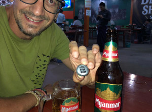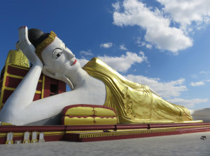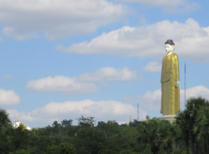 Schon über 5 km vor unserer Ankunft bei der Thanboddhay Pagoda sahen wir den überdimensionalen Buddha über den Hügeln von Monywa thronen. Unglaublich! Wir fuhren eine wenig befahrene Straße durch Felder und glaubten jeden Moment anzukommen, es zog sich aber noch eine ganze Weile, die ganze Zeit hatte der große Buddha uns im Blick. Zu Füßen des stehenden Buddha entdeckten wir aus der Nähe einen sehr großen liegenden Buddha und an einer überdimensionalen sitzenden Version wird gerade gearbeitet. In der Umgebung sitzen und stehen über 580000 Buddha Statuen auf Plätzen und am Wegesrand.