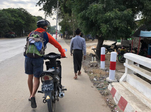 Morgens standen wir extra pünktlich auf, um das Fitnessstudio und anschließend noch mal den Pool zu nutzen. Bei einem üppigen Frühstücksbuffet stärkten wir uns für die 130 km lange Fahrt zurück nach Mandalay. Leider kamen wir nicht weit, nach etwa 10 km, bei 40 km/h schepperte es sehr laut, wir hielten an uns sahen den Schlamassel. Die Kette hatte sich vom Zahnrad gelöst und etwas in der Verkleidung verhakt. Weiterfahren konnten wir so nicht. Wir hatten Glück, ein Burmese eilte uns zur Hilfe und brachte uns zur nur 30 m entfernten Werkstatt.