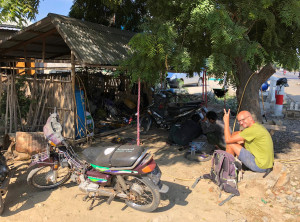 Der Mechaniker prüfte die Sachlage und machte uns zu verstehen, dass wir so nicht weiterfahren können – ja, hatten wir auch schon erkannt. Da wir uns nicht gut verständigen konnten, gaben wir ihm die Telefonnummer von Jerry unserem Mopedvermieter. Die Zwei besprachen sich und die Reparatur konnte beginnen. Ähnlich wie in Dawei mussten das Zahnrad und die Kette, die durch Verschleiß abgenutzt waren, gewechselt werden, 45 min später war alles wieder in Schuss und wir konnten unsere Fahrt fortsetzen.