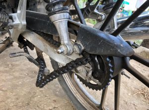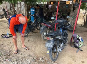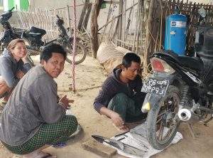 Der Mechaniker prüfte die Sachlage und machte uns zu verstehen, dass wir so nicht weiterfahren können – ja, hatten wir auch schon erkannt. Da wir uns nicht gut verständigen konnten, gaben wir ihm die Telefonnummer von Jerry unserem Mopedvermieter. Die Zwei besprachen sich und die Reparatur konnte beginnen. Ähnlich wie in Dawei mussten das Zahnrad und die Kette, die durch Verschleiß abgenutzt waren, gewechselt werden, 45 min später war alles wieder in Schuss und wir konnten unsere Fahrt fortsetzen.