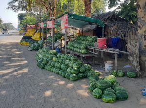 Bei unserem Start in Bagan säumten Tempel und Pagoden den Weg, später fuhren wir vorbei an Bananenplantagen und überquerten den Irrawaddy Fluss. In dieser Gegend werden Melonen angebaut, alle erdenklichen Melonenarten wurden am Straßenrand angeboten.