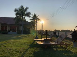 Von den vielen Buddhas und der Fahrt waren wir ziemlich erschöpft und außerdem hungrig. Wir machten uns auf dem Weg zum Hotel. Wir hatten in einem edlen Resort ein low Budget Zimmer für 19 Euro die Nacht gebucht. Wir fanden eine schicke Anlage vor und wurden mit einem Caddy über das Gelände bis zu unserm Zimmer gebracht, alles sehr hübsch.
