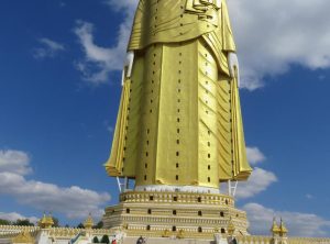 Schon über 5 km vor unserer Ankunft bei der Thanboddhay Pagoda sahen wir den überdimensionalen Buddha über den Hügeln von Monywa thronen. Unglaublich! Wir fuhren eine wenig befahrene Straße durch Felder und glaubten jeden Moment anzukommen, es zog sich aber noch eine ganze Weile, die ganze Zeit hatte der große Buddha uns im Blick. Zu Füßen des stehenden Buddha entdeckten wir aus der Nähe einen sehr großen liegenden Buddha und an einer überdimensionalen sitzenden Version wird gerade gearbeitet. In der Umgebung sitzen und stehen über 580000 Buddha Statuen auf Plätzen und am Wegesrand.