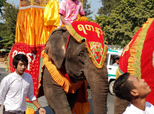 Wir fuhren sehr langsam an dieser Karawane entlang, die sich über mehrere hundert Meter erstreckte, fast wie ein Karnevalszug. An der Spitze angekommen, sahen wir drei prächtig geschmückte Elefanten, die den Zug anführten. Voller Entzücken stellte wir unser Fahrzeug ab und schauten uns nochmals in Ruhe die vorbeiziehende Karawane an. Vielleicht handelte es sich um eine Sonntagsprozession, die auf dem Weg zur nächsten Pagode war. Genaues wissen wir nicht, egal es war eine nette Abwechslung.