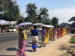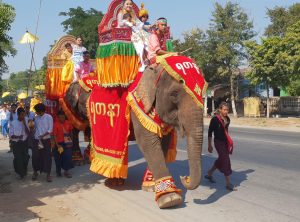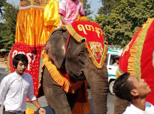 Wir fuhren sehr langsam an dieser Karawane entlang, die sich über mehrere hundert Meter erstreckte, fast wie ein Karnevalszug. An der Spitze angekommen, sahen wir drei prächtig geschmückte Elefanten, die den Zug anführten. Voller Entzücken stellte wir unser Fahrzeug ab und schauten uns nochmals in Ruhe die vorbeiziehende Karawane an. Vielleicht handelte es sich um eine Sonntagsprozession, die auf dem Weg zur nächsten Pagode war. Genaues wissen wir nicht, egal es war eine nette Abwechslung.