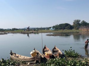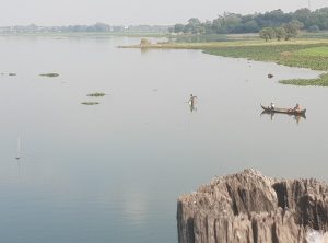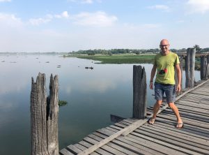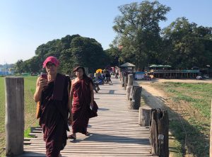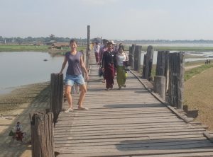 Die Brücke ist ein Fußgängerübergang, über den der Taungthaman See überquert werden kann. Sie ist 1,2 Kilometer lang, wurde um 1850 erbaut und gilt als älteste und längste Teakholz-Brücke der Welt. Die Brücke wurde nach dem Auftraggeber Herrn O Bein, X Bein – ach ne U Bein benannt. Sie ist besonders zum Sonnenuntergang ein beliebtes Ausflugsziel. Etwa In der Mitte der Brücke machten wir eine Rast. Es führt eine Treppe nach unten und am unteren Ufer gab es ein kleines Restaurant in einer Bambuskonstruktion. Wir beobachteten das Treiben auf dem See bei einer frischen Kokosnuss, anschließend machten wir uns weiter auf den Weg in das Stadtzentrum.