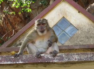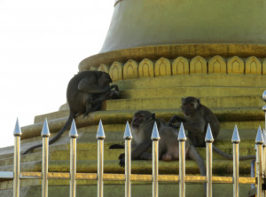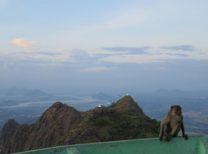 Oben angekommen fanden wir uns leider auf einer Baustelle wieder. Es sah danach aus, als ob eine neue Aussichtsplattform gebaut werden soll. Wir hatten über Hpa-an und den anliegenden Fluss einen super Blick Richtung Sonne, leider schoben sich ein paar Wolken dazwischen. Trotzdem war es wunderschön. Wir gingen zu einer Terrasse mit Bänken und dachten, hier die Aussicht genießen zu können. Sobald wir uns hingesetzt hatten, kam eine Affenhorde, die es auf den Inhalt unseres Rucksacks abgesehen hatte. Wir versuchten, die Bande heldenhaft mit einem Stock und unseren Schuhen in Schach zu halten, mussten uns aber letztendlich zurückziehen.