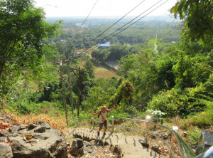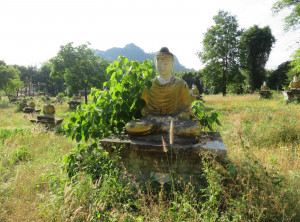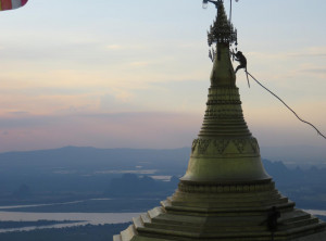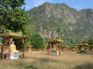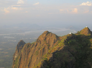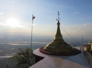 Nachmittags fuhren wir an den Fuß des höchsten Berges der Umgebung, um vom Gipfel den Sonnenuntergang zu sehen. Zunächst ging es durch den Lumbini Garten. Dort stehen auch wieder tausende Buddhastatuen – die Burmesen können anscheinend nicht genug davon bekommen. Die 600 Meter Höhenunterschied zum Gipfel bewältigten wir hauptsächlich über unterschiedlich hohe und lange Treppenstufen, das war zudem wegen der Hitze wirklich sehr anstrengend. Aber der Blick über die Ebene und die daraus aufragenden Berge wurde von Meter zu Meter genialer und alle Anstrengung wurde dadurch belohnt. Wir benötigten insgesamt zwei Stunden für den Aufstieg zur Pagode und zum Kloster.