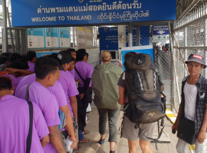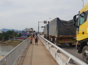 Um 8:15 Uhr ging es dann endlich los und wir kamen bis auf einem kleinen Stück mit einer schlechten Strasse schnell voran, so dass wir gegen 11:30 Uhr an der Brücke standen, die Myanmar mit Thailand verbindet. Zunächst mussten wir auf der burmesischen Seite unsere Pässe für die Ausreise vorzeigen, bevor wir zu Fuss über die Friendship Bridge die paar hundert Meter zu der thailändischen Passkontrolle marschierten. Auch hier ging alles sehr fix und kurze Zeit später saßen wir in einem Tuk Tuk, das uns zum Busbahnhof des thailändischen Grenzortes Mae Sot brachte, der ein paar Kilometer entfernt liegt.