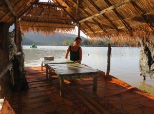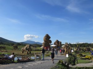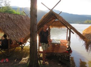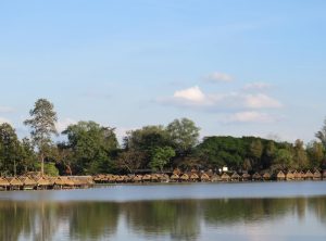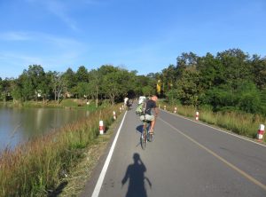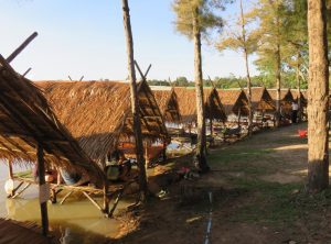 Von unserem Gastgeber erhielten wir auch ein paar Tips und so machten wir uns am sonnigen Samstagmittag mit dem Fahrrad auf zu einem 15 km entferntem See, er ist ein beliebtes Ausflugsziel der Thais. Es gab eine Seilbahn über den See, eine Ausstellung mit ein paar sehr großen Tieren aus Heu, Angler und ein paar Restaurants, deren Tische in Strohhütten am Ufer untergebracht sind. Eine Weile wurden wir, obwohl wir am anderen Ufer saßen, mit Weihnachtsmusik unterhalten – zum ersten Mal in diesem Jahr.