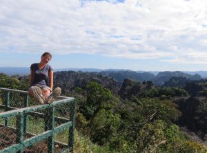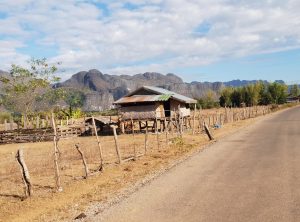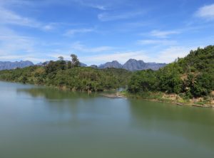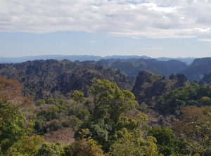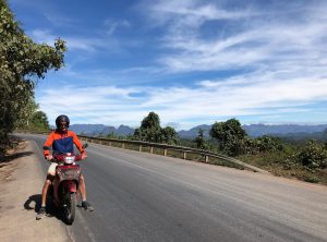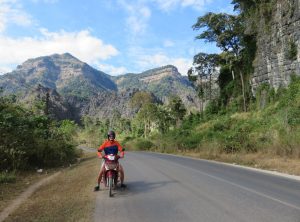 Mit unserem heißen Ofen unterm Hintern machten wir uns auf zu unserer fünftägigen 500 Kilometer langen Reise – den Thakhek Loop. Die ersten Kilometer folgten wir dem Highway aus der Stadt heraus. Die Landschaft war etwas öde und die Straße schnurgerade. Nach etwa 80 Kilometern ging es Richtung Osten, diese Straße führte uns kurvenreich bergauf. Von einem Aussichtspunkt könnten wir über die atemberaubenden Berge des Kalkfelsenwaldes blicken. Auf dieser Straße kamen uns einige vietnamesische LKWs entgegen, da sie bis zum Grenzübergang nach Vietnam Nam Phao führt. Die Landschaft war jetzt sehr abwechslungsreich, wir sahen bewaldete Hügel, Klippen, karges Land, Büffelherden und schließlich Reisfelder und große Tabakplantagen.