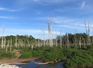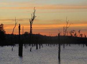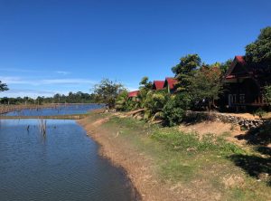 Nach unserer Pause ging es weiter nach Thalang, wir fuhren schon einige Kilometer an einem Stausee, dem Nam Theun 2, entlang dem sich ein beeindruckendes Bild bot. Diesen See gibt es erst seit 2005 und überall ragen die kahlen Stämme des einstigen Waldes aus dem Wasser empor. Ingesamt ist der See fast 60 Kilometer lang. Unsere Hütte für die nächste Nacht lag direkt am Ufer des Sees und hatte eine perfekte Lage für den Sonnenuntergang. Die Gegend hat etwas unwirkliches, leider ist es das Ergebnis des Eingriffs der Menschen in die Natur.