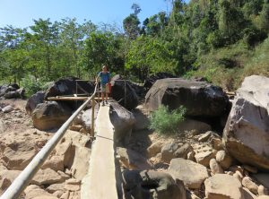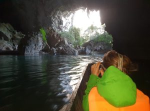 Das Highlight, welches uns an diesen abgelegenen Ort gelockt hat, ist die Konglorhöhle – diese Höhle ist genau genommen ein 7,5 Kilometer langer Tunnel, der durch einen gigantischen Kalksteinfelsen führt. Wir nutzten die Möglichkeit direkt von unserer Unterkunft, die am Fluss liegt, mit einem Taxi Boot zu fahren. Die Anreise zur Höhle auf dem Wasserweg war schon sehr spektakulär. Auf super klarem Wasser im Fluss ging es durch unberührte Natur, vorbei an felsigen Bergen und dem Dorf Konglor bis zum Eingang der Höhle.