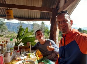 Am nächsten Tag hatten wir uns nur ein paar Kilometer und dafür mehrere Stopps vorgenommen. Am ersten Punkt spazierten wir zu einem Aussichtspunkt und genossen den Blick über die hügelige Landschaft bis zur vietnamesischen Grenze. Über den Bergen in der Ferne hingen dunkle Wolken, bei uns war blauer Himmel, aber bei Temperaturen um die 20 Grad auch nicht wirklich warm. Den nächsten Halt machten wir am Tad Song Souk Wasserfall. Es war erst Mittag und wir ruhten uns etwas aus. Bis zum Nachtquartier waren es nur noch 30 Kilometer.