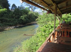 Am Nachmittag gingen wir im Dorf zum Essen, wir saßen in einer kleinen Hütte am Fuß eines Berges umgeben von Tabakplantagen. Überall flogen und hüpften Hühner rum, einige Hähne saßen auf Bambusstäben. Fast alle Gerichte in diesem Restaurant waren mit Hähnchen und so entschieden auch wir uns für ein Hähnchencurry, welches wirklich köstlich war. Eine gute Gelegenheit den Silvesterabend schon mal mit einem BeerLao einzuläuten.
