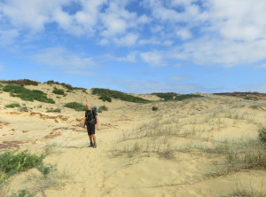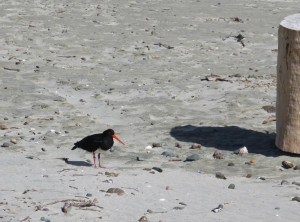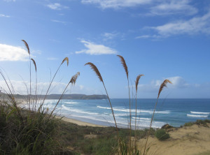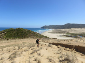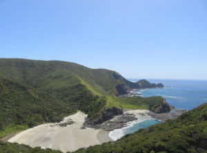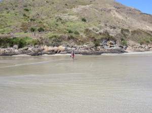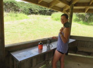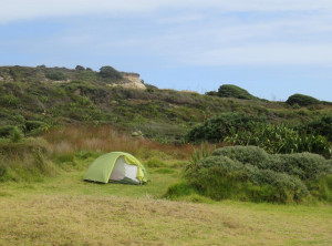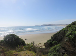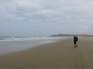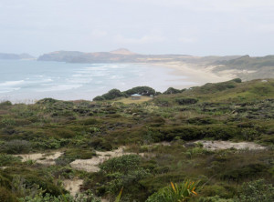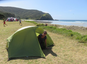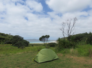 Anfangs wanderten wir auf einem Weg mit grünen Weiden und vielen Schafen rechts und links. So hatten wir uns Neuseeland vorgestellt 😉 Weiter ging es entlang sehr hoher Sanddünen zu einem weiten Sandstrand, wo wir den einzigen anderen Wanderer an diesen Tag trafen, einen jungen Mann aus Texas. Über einen Hügel ging es dann zu unserem ersten Etappenziel – den kostenlosen und nur zu Fuß erreichbaren Campingplatz Twilight Beach. Vor Ort gab es Wasser, eine überdachte Picknickhütte, Toiletten und eine grandiose Sicht über den von steilen Klippen gesäumten Sandstrand. Einfach nur spitzenmäßig und wir waren die einzigen Gäste hier! Wir bauten unser Zelt auf, stellten unsere Rucksäcke unter die Unterdachung und verbrachten den Nachmittag am kilometerlangen Strand, den wir für uns alleine hatten. Unglaublich…