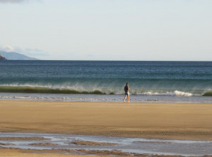 Da die Wolken immer dunkler wurden, entschieden wir uns, nicht auf Campingplatz Stony Bay zu übernachten, sondern zum nächsten Campingplatz in der Waikawau Bay weiter südlich zu fahren. Die Fahrt über die holprigen Schotterpiste dauerte nochmals eine Stunde und wir schafften es rechtzeitig, unser Zelt aufzubauen und kurz am schönen langen Sandstrand vorbei zu schauen, bevor leichter Nieselregen und sehr starker Wind aufkamen. Ein Zelt in der Nähe brach deshalb bei einsetzender Dunkelheit komplett zusammen und die armen Besitzer mussten es abbauen. Unser kleines Zelt aber hielt dem Wind zum Glück stand und wir konnten entspannt einschlafen. Am Morgen spazierten wir nochmals zum Strand und setzten anschließend unsere Reise zum nächsten Wanderziel fort.