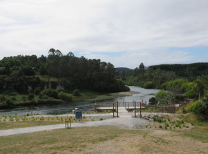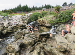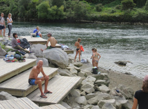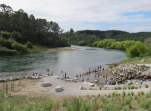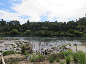 Also fuhren wir weiter in den nahegelegenen Spa Park. Hier gibt es eine heiße Quelle, die in einen kalten Fluß, den Waikato mündet und deren Besuch kostenlos ist. Schon auf dem Parkplatz kamen uns einige Personen in Badebekleidung entgegen. Wir gingen Richtung der Quelle und kurze Zeit später saßen wir im anfangs fast schon zu warmen Wasser. Unsere ausgestreckten Füße ragten noch in das kalte Wasser des Waikato. Wir genossen das Bad im warmen Wasser wirklich sehr und sprangen zwischendurch aber auch in den kalten Fluss.