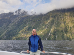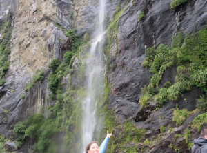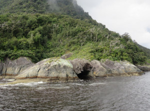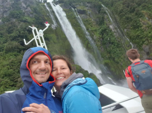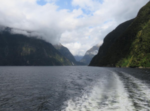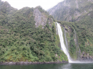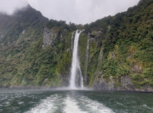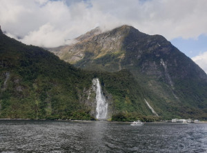 Eine sehr gute Art, die spektakuläre und wilde Landschaft zu erkunden, ist eine zweistündige Bootsfahrt auf dem Fjord. Also kauften wir drei Tickets und es ging an Deck eines der zahlreichen Schiffe und hinauf aufs Wasser. Das Wetter war unbeständig und ein schneller Mix aus Regentropfen und kurzzeitigem Sonnenschein. Der Milford Sound ist eine der regenreichsten Regionen der Erde und daher stürzen auch hier unzählige Wasserfälle aus großer Höhe direkt ins Meer. An einem der Wasserfälle ließ sich der Käpitän den Spaß nicht nehmen, so weit heranzufahren, dass alle Gäste auf dem Deck eine ordentliche Ladung Wasser abbekamen. Wir flüchteten gerade noch rechtzeitig, bevor wir komplett nass wurden.