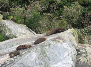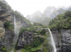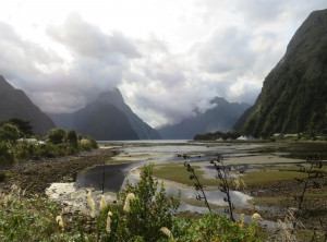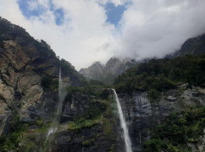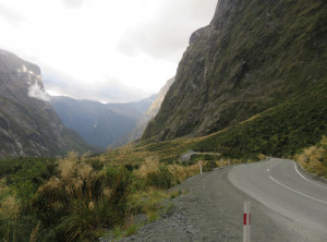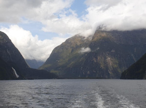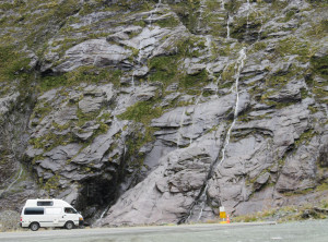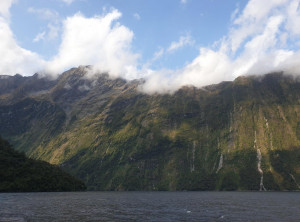 Die Fahrt zum Sound führte ab dem Ort Te Anau durch eine spektakuläre alpine und rauhe Landschaft. Die Gipfel der steil aufragenden Berge waren teilweise in Wolken gehüllt und an den Hängen stürzen unzählige Wasserfälle hinunter. Unser Camper hatte ganz schon zu kämpfen auf der kurvigen, engen Strasse. Zum Schluss ging es noch durch einen abenteuerlichen Tunnel, bevor es steil hinab zum Milford Sound geht, einer Meeresbucht, die den Fjorden Norwegens ähnelt.