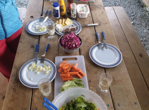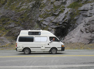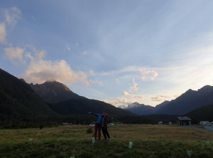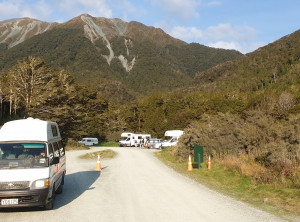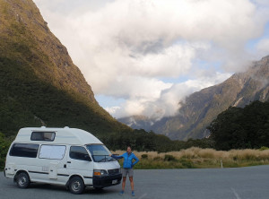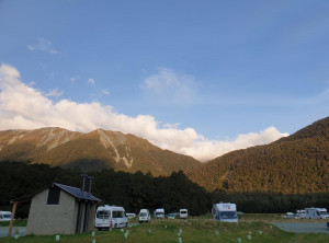 Da die Übernachtungsmöglichkeiten in Milford selbst sehr begrenzt sind, fuhren wir die Straße wieder ein Stück zurück zu einem sehr schön gelegenen Naturcampingplatz. Das Wetter klarte auf und wir bekamen in Abendlicht ein wunderschönes Bergpanorama zu sehen. Zum Abendessen bereiteten wir uns eine leckere Brotzeit, bevor wir es uns mit Weißwein und Uno im Camper gemütlich machten.