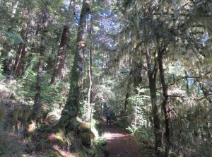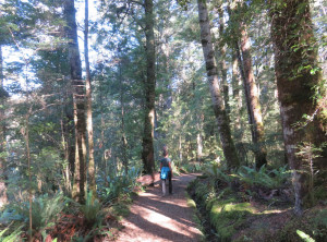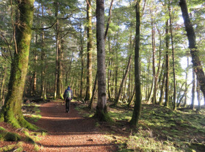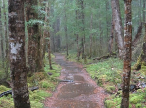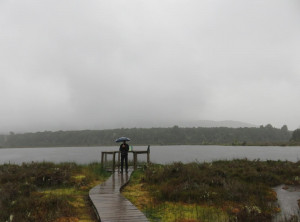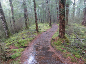 Am nächsten Morgen setzte der angekündigte Starkregen ein – was für ein Schauspiel in dieser Landschaft! Der Wind peitschte den Regen durch das Tal und von den steilen Hängen stürzten Wassermassen hinunter. Aufgrund dieses Wetters mussten wir aber leider eine Wanderung, die wir gerne gemacht hätten, sausen lassen und fuhren nach Te Anau zurück. Nachmittags machten Niko & ich trotzdem noch eine kleine Regenwanderung durch einen schönen Wald. Mit Regenschirmen bewaffnet ging es los, somit liefern wir hier die schon längst überfälligen Regenbilder. Der Regen wollte an diesem Tag einfach nicht aufhören, für den nächsten Tag war aber Sonne pur angesagt – beste Voraussetzungen für den Keppler Track bis hinauf zum Mt Luxmore – 34 Kilometer mit über 1.200 Höhenmetern hin und zurück.